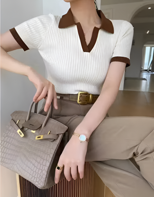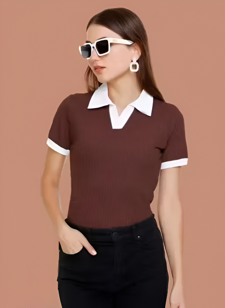 Trendy Ribbed Contrast Collar Polo T-Shirts for Women – Bold & Stylish